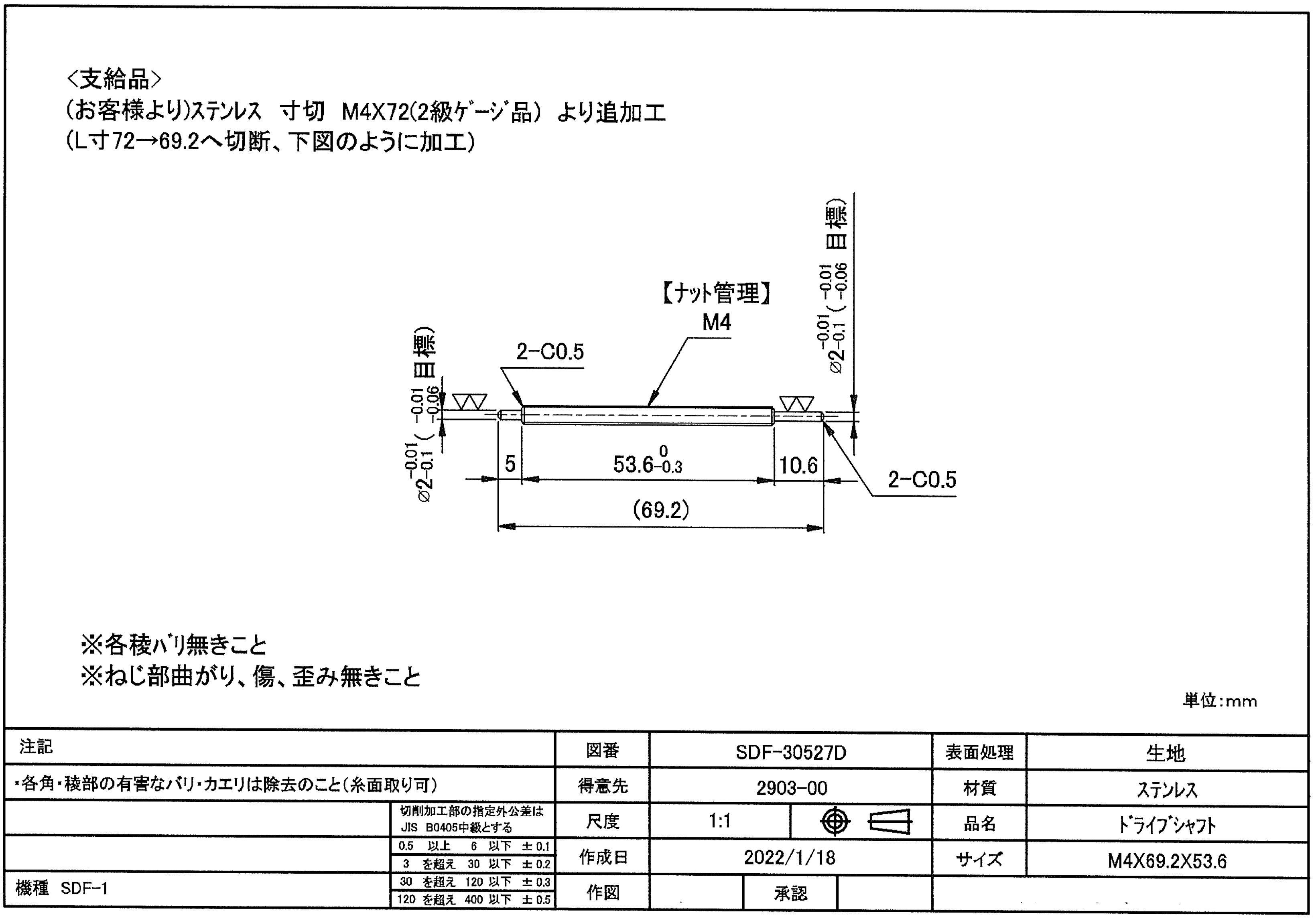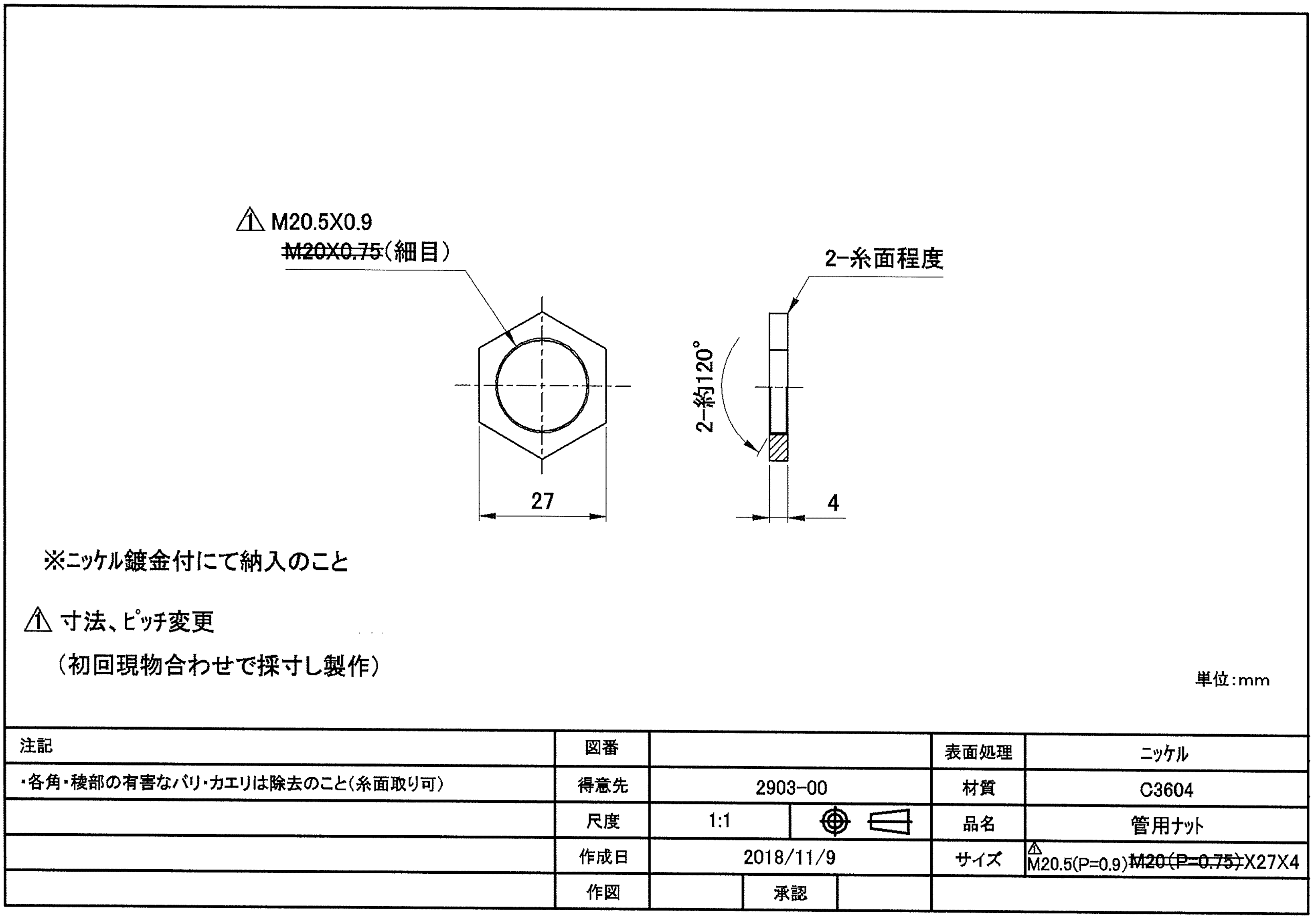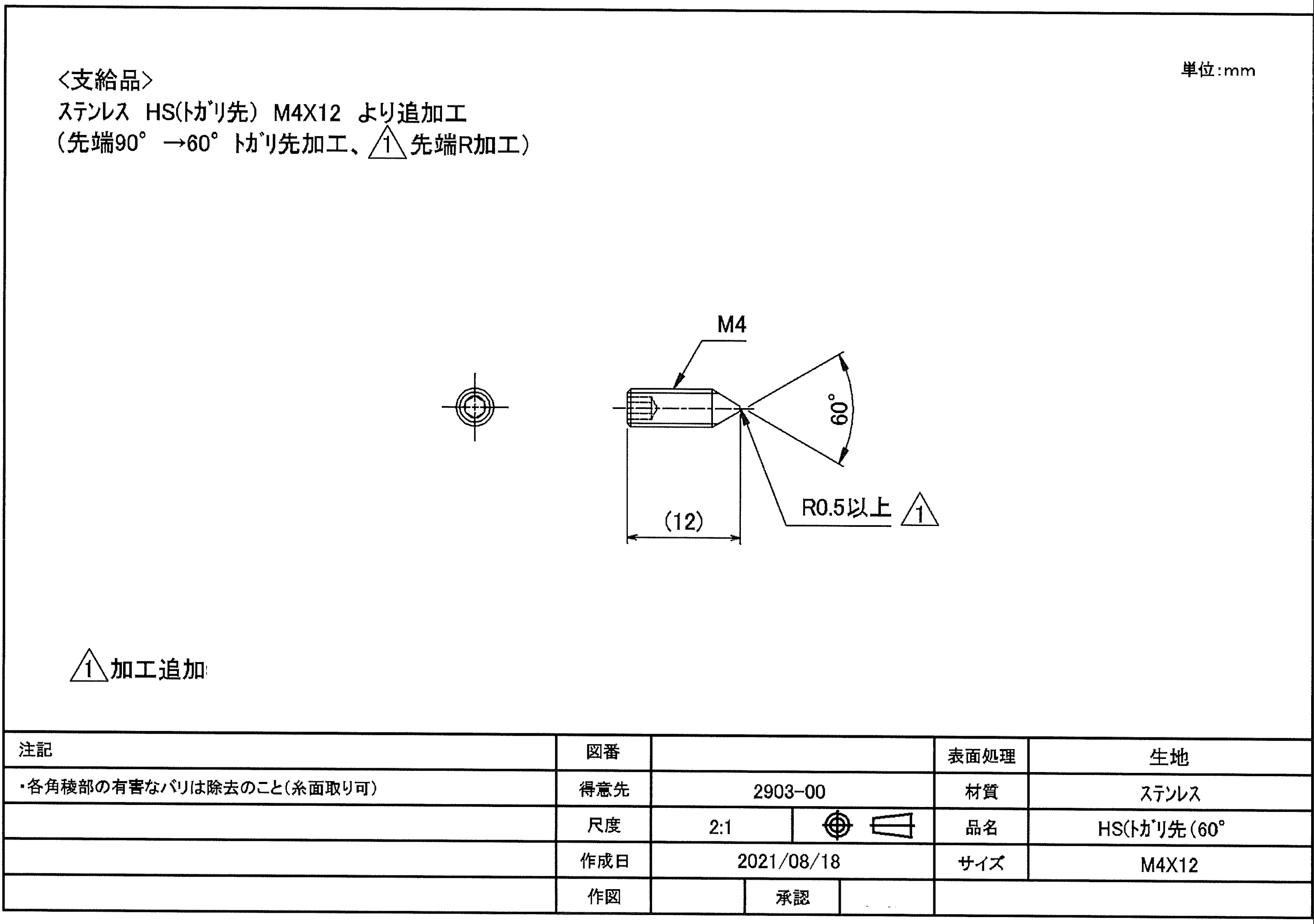 ネジ業界には、他業界とは少し異なる独特の商習慣がいくつか存在します。そのひとつが「追加工」といわれるネジ部品の加工領域です。昭和から続く製造装置には世の中に売っていない特殊な図面部品が多く使用されており、その中に通常売っている既製品ねじを少しだけ加工した特殊図面などが何点も存在しております。