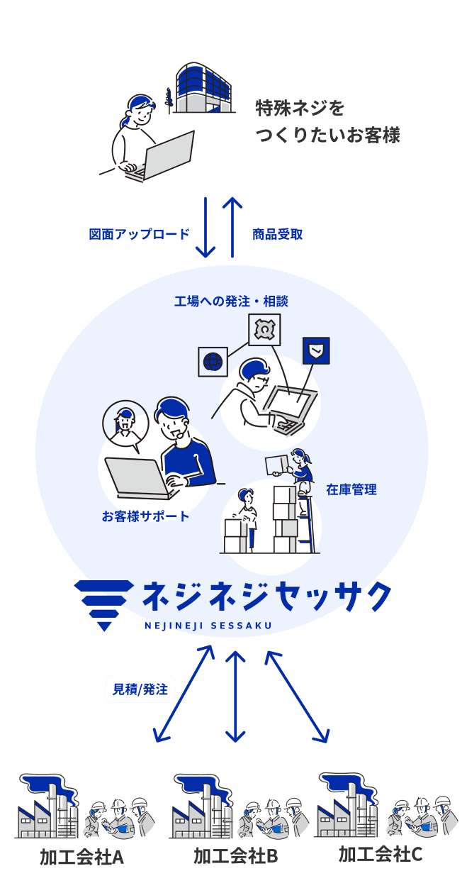 ネジネジセッサクは、ネジに特化した発注者と受注者をマッチングするサービスです。